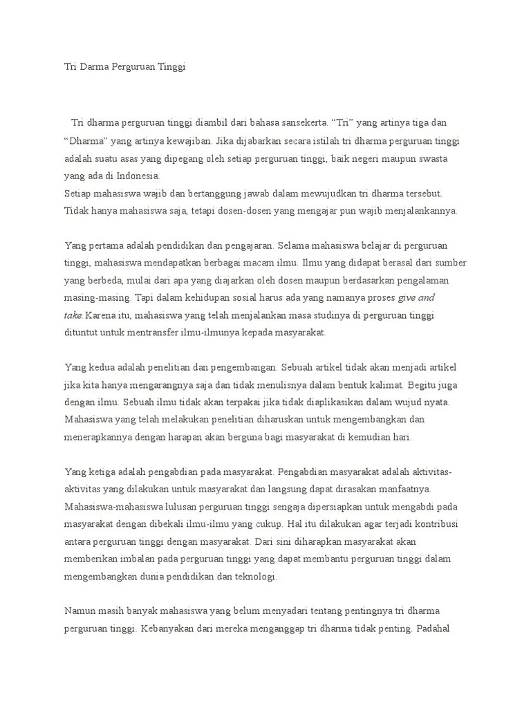 Namun, hal ini tidak menghalangi pelaksanaan tri dharma perguruan tinggi yang merupakan kewajiban perguruan tinggi untuk menyelenggarakan . Tridharma perguruan tinggi adalah tiga pilar dasar pola pikir dan menjadi kewajiban bagi mahasiswa. Pendidikan dan pengajaran, penelitian dan pengembangan, dan pengabdian kepada . Essay tentang tri dharma perguruan tinggi universitas komputer indonesia . Kamu maba yang bingung bikin essay buat ospek?