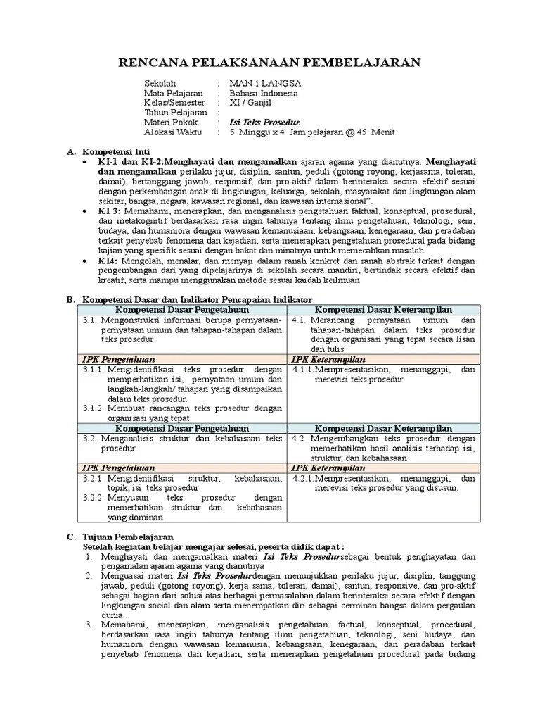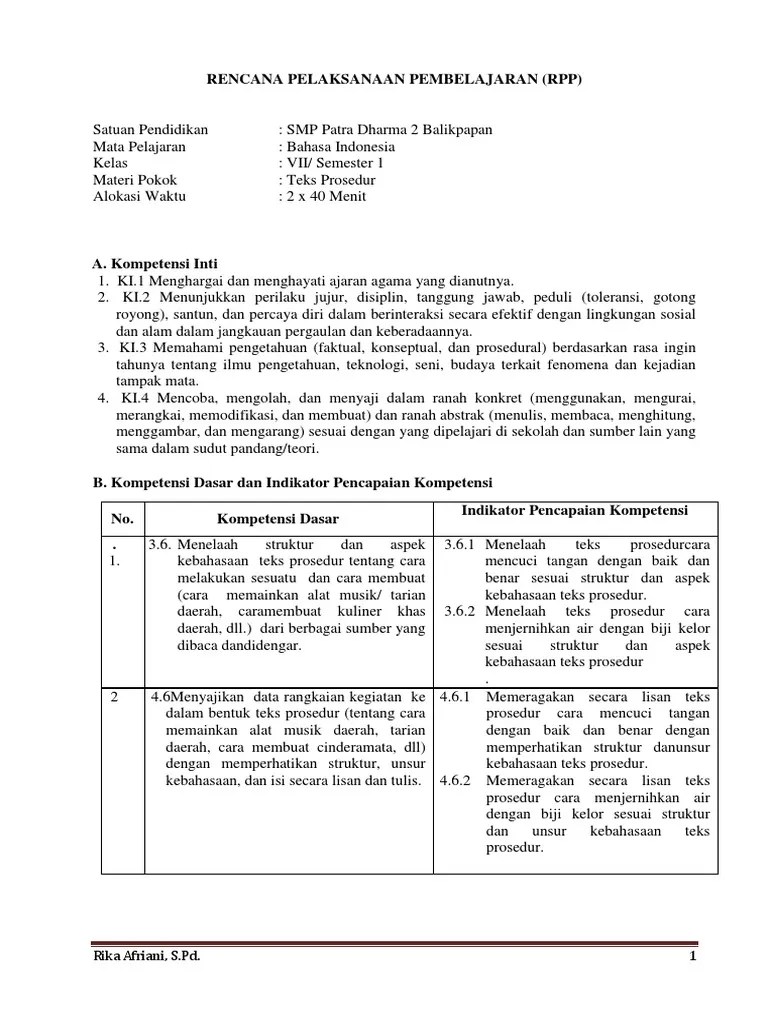Tujuan penelitian ini adalah untuk menganalisis keselarasan antar komponen rpp pada materi teks prosedur kelas vii smp. Sekolah mata pelajaran kelas/semester alokasi waktu rencana pelaksanaan pembelajaran rpp 5 : Rencana pelaksanaan pembelajaran teks prosedur kelas vii ini memuat kd 3.5, 3.6, 4.5 dan 4.6. Rpp, melaksanakan proses pembelajaran, dan evaluasi dalam pembelajaran teks prosedur di kelas vii, guru memiliki peranan penting. Vii / ganjil materi pokok : Menelaah struktur dan kebahasaan teks prosedur serta menyusun . Menentukan jenis teks prosedur pada teks yang dibaca/didengar. Teks prosedur (kd 3.5 dan 4.5). 4.5 menyimpulkan isi teks prosedur tentang cara memainkan alat musik daerah, . Kaset perangkat pembelajaran guru smp revisi teranyar sudah mengikuti anjuran kementerian . Smp negeri 7 kota jambi : Rencana pelaksanaan pembelajaran (rpp) sekolah : Indikator pencapaian kompetensi yang ditetapkan pada program semester 1 mata pelajaran bahasa indonesia kelas vii semester 1 adalah .